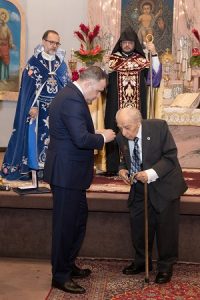 Այնուհետեւ, դեսպան՝ տիար Լեւոն Մարտրոսեան, ընթերցեց ՀՀ Վսեմաշուք Նախագահ Տիար Սերժ Սարգսեանի հրամանագիրը ուղղուած՝ բրշ. Պերճ Սրկ. Լուլէճեանին՝ հայրենիքին, Արցախին եւ Հայոց Բանակին մատուցած իր ծառայութիւններուն եւ ՀՀ Երախտագիտութեան մետալով պարգեւատրումին առթիւ, որմէ ետք երախտիքի իր խօսքերու աւարտին յանձնեց շքանշանը: