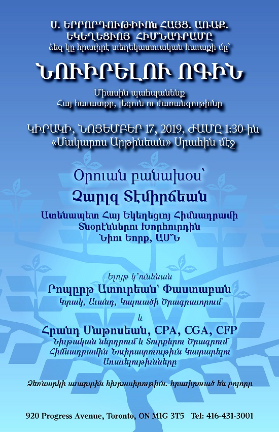 Ձեր ներկայութիւնը հաստատելու համար կը խնդրենք հեռաձայնել եկեղեցւոյ գրասենեակ 416 431 3001 թիւին, մինչեւ 12 Նոյեմբեր։
