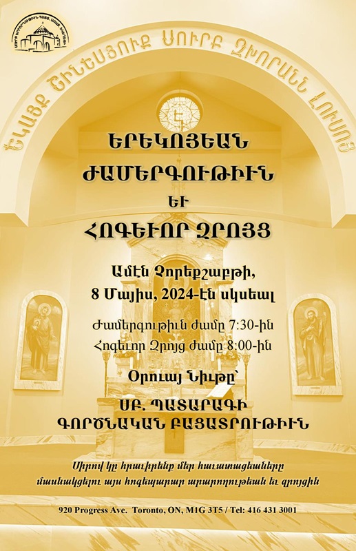 HTAC 920 Progress Avenue, Toronto, Ontario, CanadaԱՍՏՈՒԱԾԱՇՈՒՆՉԻ ՍԵՐՏՈՂՈՒԹԻՒՆ Ամէն Հինգշաբթի Առաւօտեան ժամերգութիւն՝ 10։30-ին Սերտողութիւն՝ 11։00-ին Միացէք Մեզ Եկեղեցւոյ Մէջ կամ հեռաձայնով Տեղեկութիւններու համար կապ հաստատել՝ HTAC.BibleStudy@gmail.com