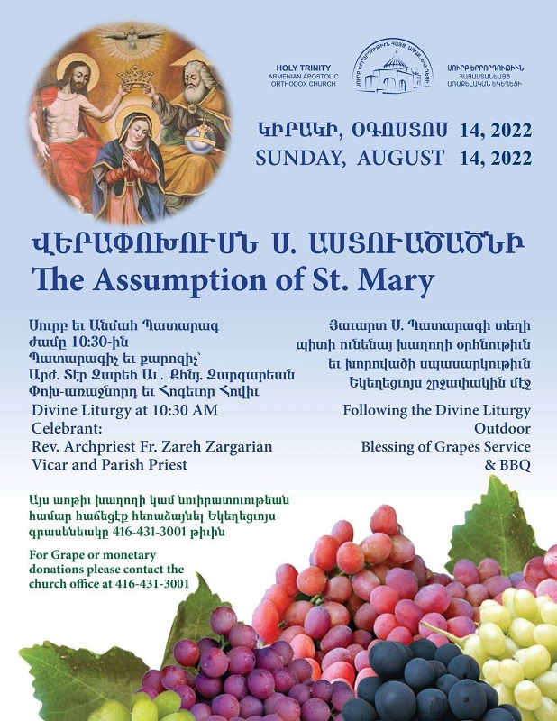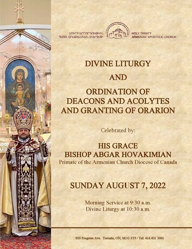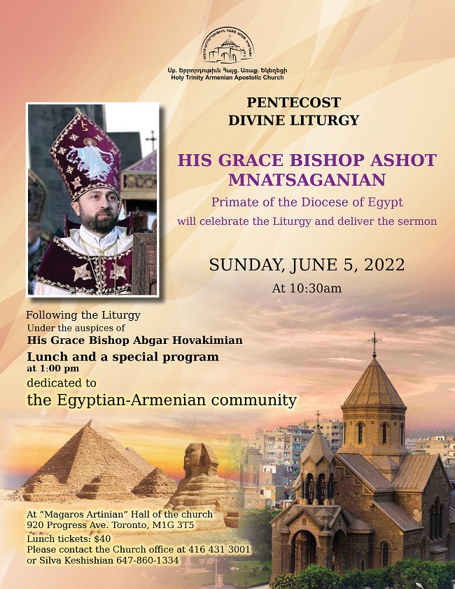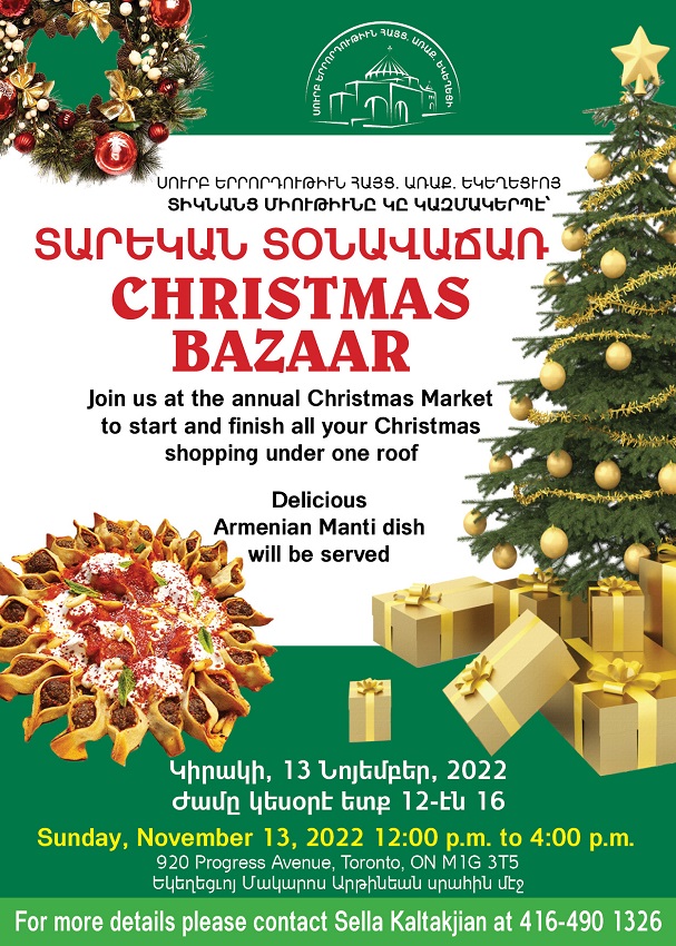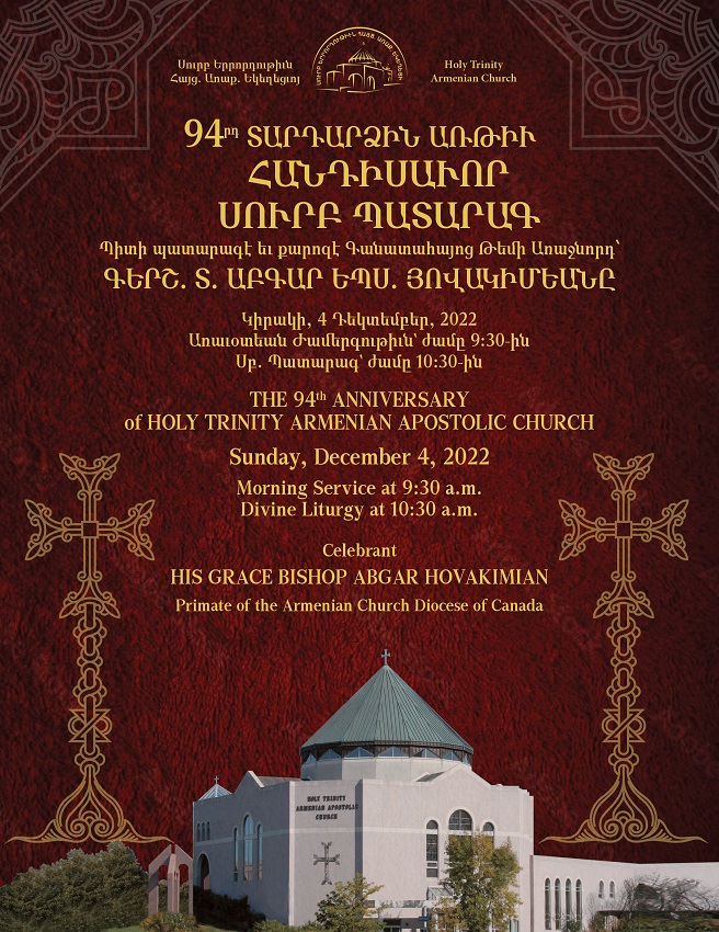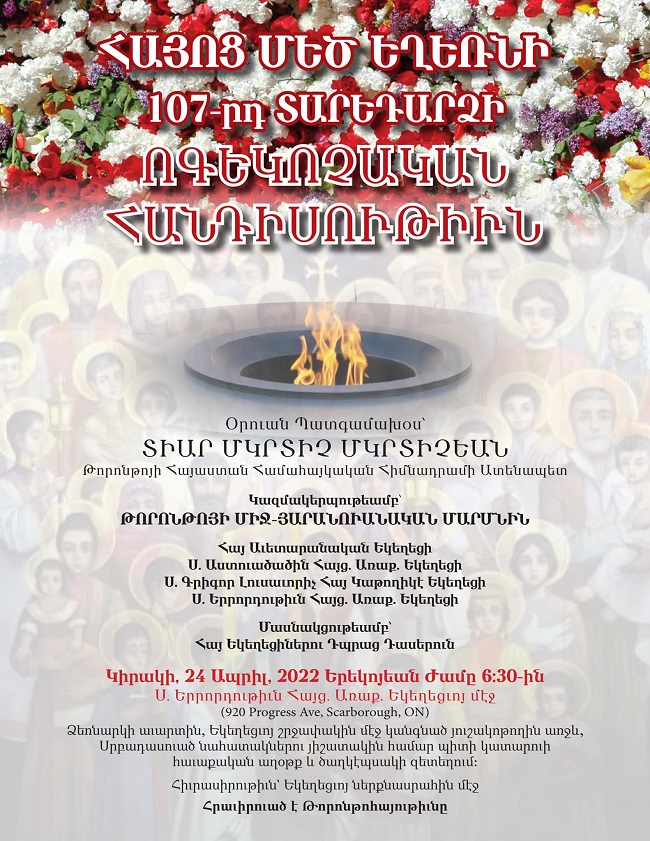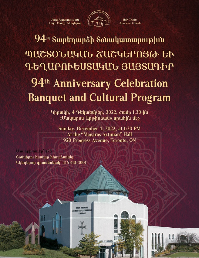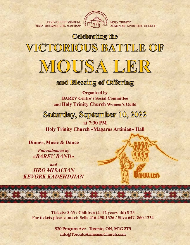 HTAC 920 Progress Avenue, Toronto, Ontario, CanadaOn the occasion of Easter, Barev Centre’s Social Committee invites you to enjoy an evening of Live Music: BAREV Band and a special guest, violinist: Hovhannes Moubayed Dance and Dinner On Sunday, April 17, 2022 at 7 pm Holy Trinity Armenian Church’s “Magaros Artinian” Hall 920 Progress Avenue, Toronto For tickets please call Silva at […]