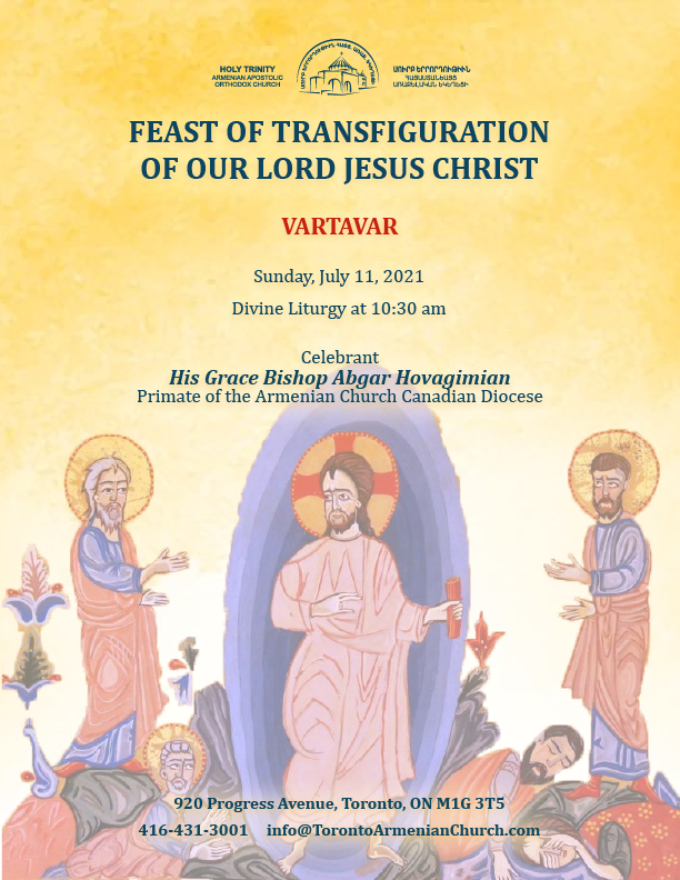FEAST OF TRANSFIGURATION OF OUR LORD JESUS CHRIST VARTAVAR Sunday, July 11, 2021 - Divine Liturgy at 10:30 am Celebrant His Grace Bishop Abgar Hovagimian Primate of the Armenian Church Canadian Diocese We encourage faithful parishioners to attend the service in person or follow the live-streaming on Facebook.com/TorontoArmenianChurch 920 Progress Avenue, Toronto, ON M1G 3T5 Tel: […]