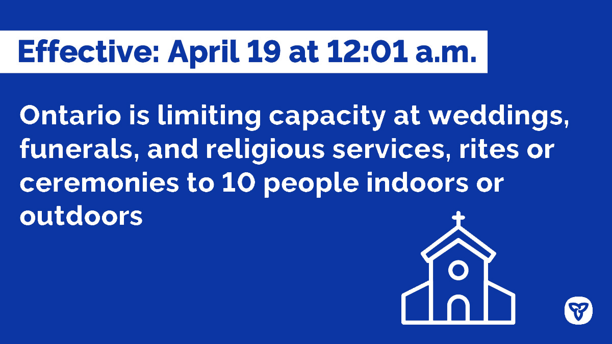 Սիրելի հաւատացեալներ,Օնթարիոյի Կառավարութեան յայտարարութեան համաձայն, Երկուշաբթի, 19 Ապրիլ, 2021-էն սկսեալ, Կիրակնօրեայ Պատարագները, Հոգեհանգստեան արարողութիւնները, ինչպէս նաեւ Չորեքշաբթի երեկոյներու աղօթքները տեղի պիտի ունենան գոց դռներու կարգով: