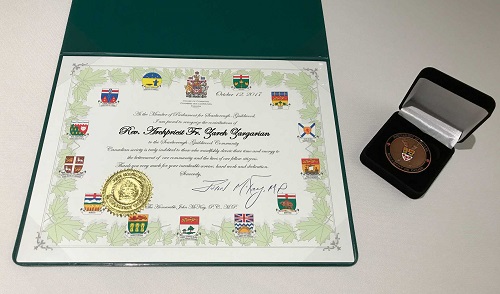 On October 12, 2017, the Hon. John McKay, M.P. of Scarborough Guildwood presented the Scarborough Guildwood Medal to Rev. Archpriest Fr. Zareh Zargarian, Vicar of the Armenian Church Diocese of Canada and Parish Priest of Holy Trinity Armenian Church of Toronto for his commitment and contributions to the community and for his active role in making this city a place that we are proud to call home.