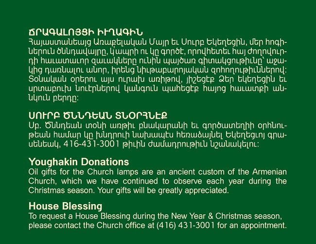 Սբ. Ծննդեան տօնի առթիւ իմ սէրն ու գնահատանքը կը յայտնեմ բոլոր անոնց, որոնք անցնող տարուայ ընթացքին իրենց ծառայութեամբ եւ նիւթական նուէրներով նպաստեցին մեր Սբ. Եկեղեցւոյ պայծառութեան: Թող բարին Աստուած վարձահատոյց ըլլայ բոլորիդ: